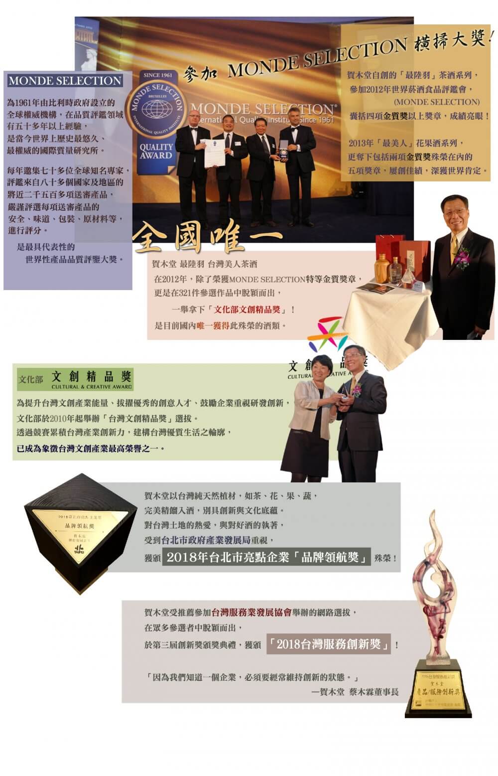 在2012年·除了榮用MONDE SELECTION特等金質獎章,更是在321件参選作品中脫穎而出。一舉拿下「文化部文創精品獎」!